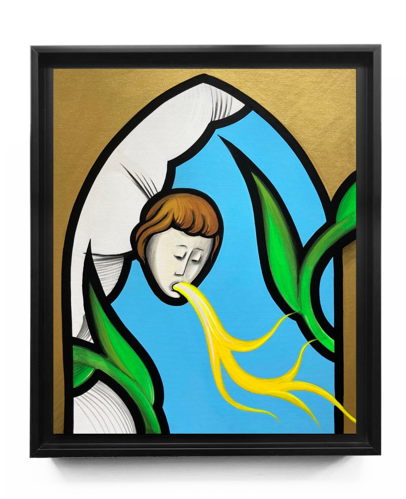 Il peint sur différents supports, toiles, murs, encombrants, un univers mêlant cette iconographie médiévale à des références plus contemporaines comme celle des jeux vidéos avec lesquels il a grandi.